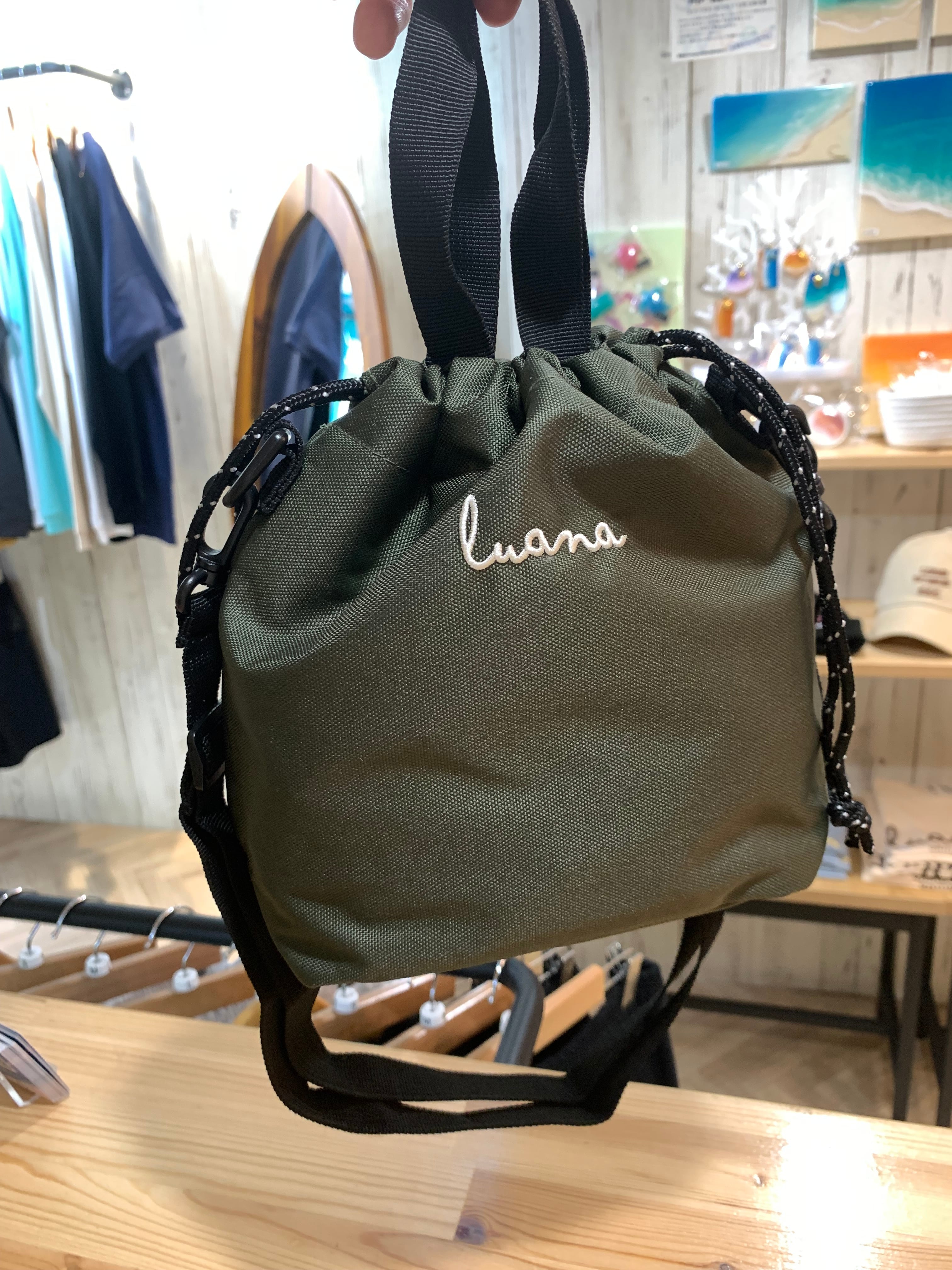 巾着バッグとして手に持ってもよし、ショルダーバッグとして